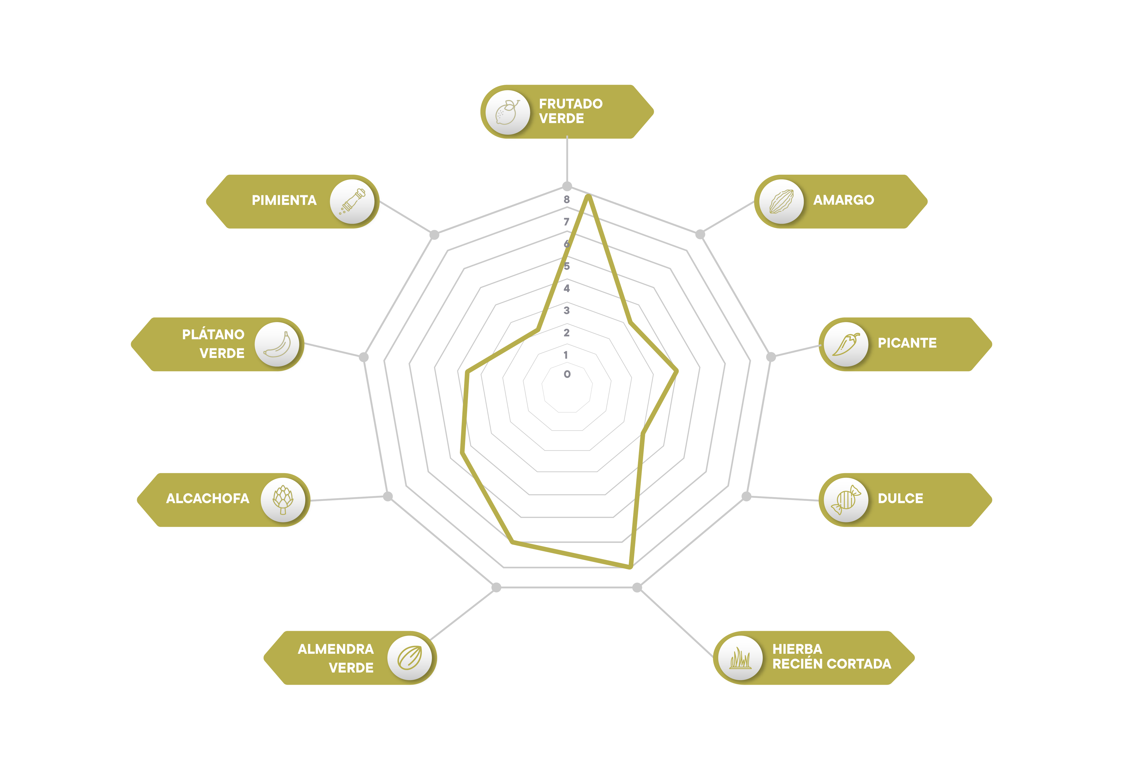 - Aroma y Sabor Inconfundibles: El alto contenido en polifenoles le confiere su gran personalidad con atributos de amargo y picante. La vitamina E que posee le hace un gran antioxidante natural. Entre sus atributos organolépticos, predominan la hierba recién cortada y la almendra verde, con matices de alcachofa, plátano verde.
